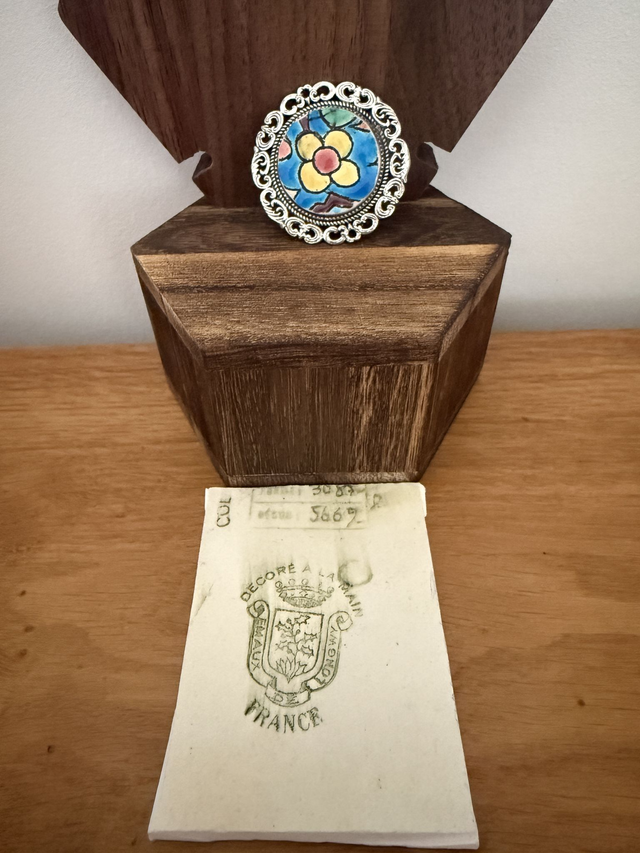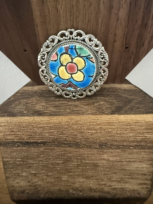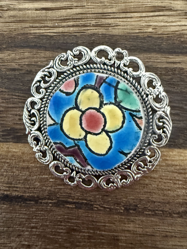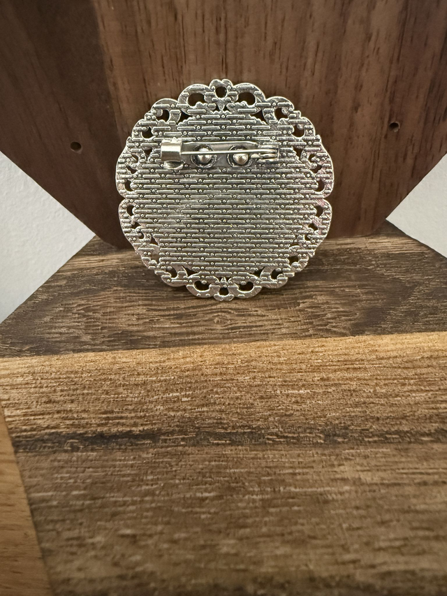 Cette jolie broche ronde argentée fait ressortir un fragment d'assiette Longwy. Ce fragment a été taillé et façonné dans une assiette fêlée et ébréchée.