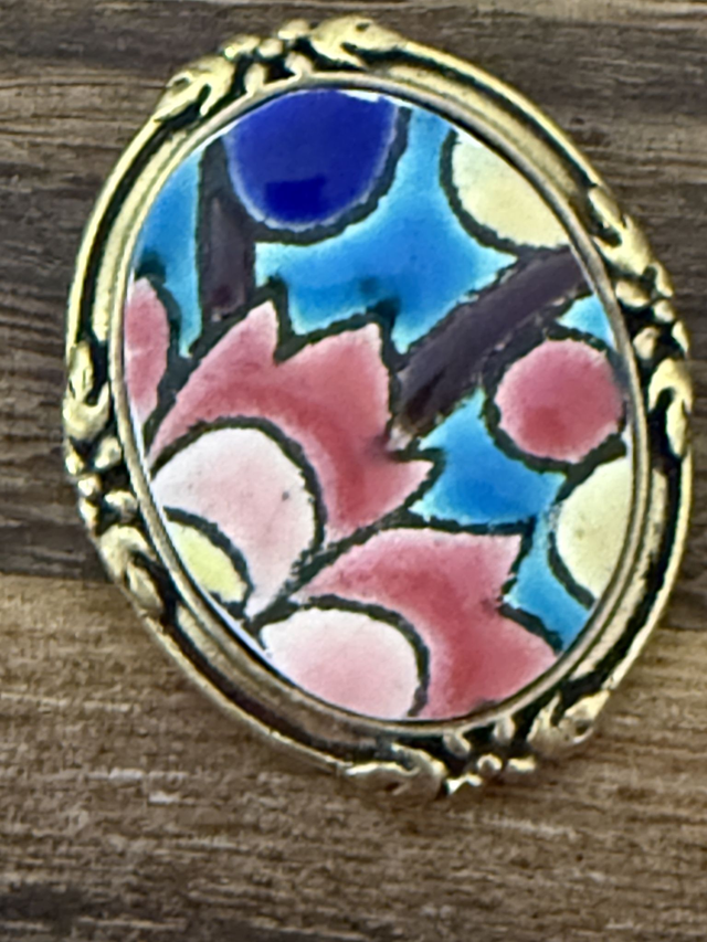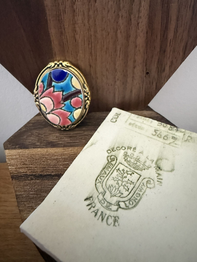 Cette jolie broche ovale dorée fait ressortir un fragment d'assiette Longwy. Ce fragment a été taillé et façonné dans une assiette fêlée et ébréchée.