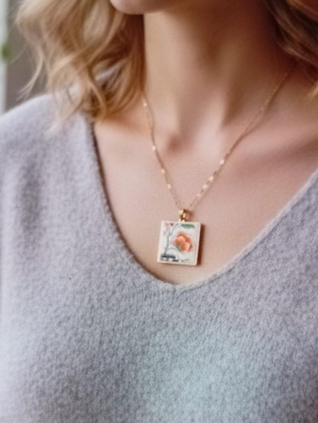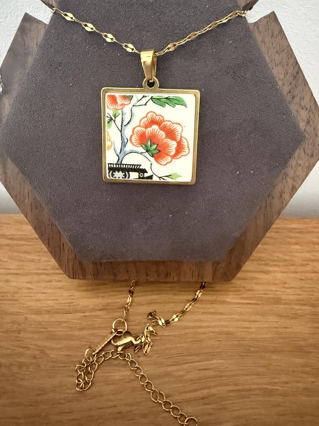Sublimez votre décolleté avec une pièce unique chargée d’histoire. Ce médaillon carré a été réalisé à partir de vaisselle ancienne transformant un fragment de faïence délicate en un bijou moderne et élégant.
