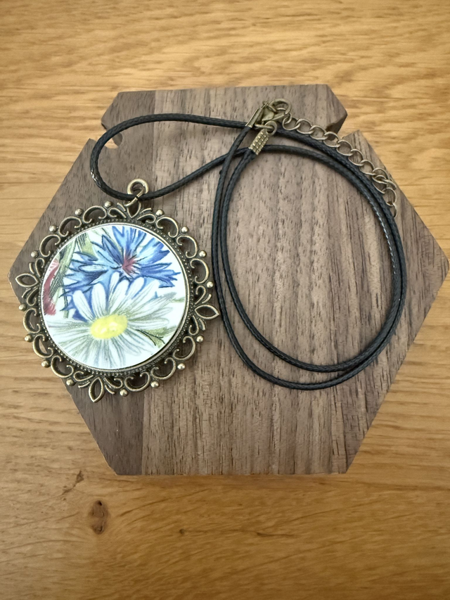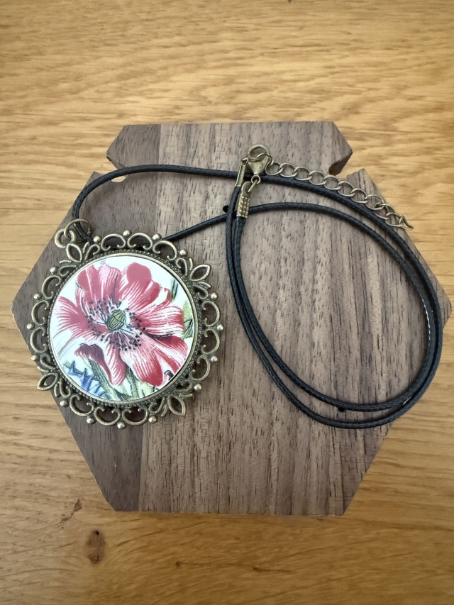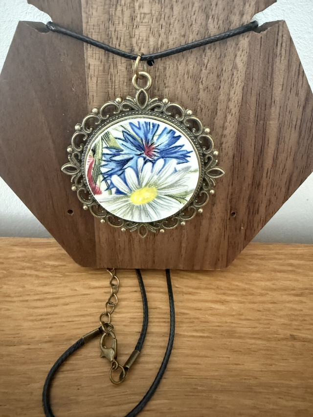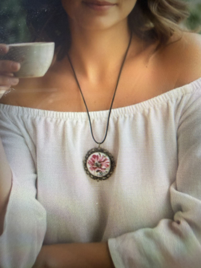 Apporter une touche de poésie et d’histoire à votre tenue avec ce magnifique collier "double face" artisanal. Ce bijou unique est réalisé à partir de deux fragments de vaisselle ancienne soigneusement sélectionnés et façonnés à la main. Le médaillon rond met en scène de superbes fleurs épanouies aux détails délicats et aux nuances vibrantes. Les fragments de faïence sont sertis dans une monture de style cabochon en métal bronze vieilli. Le pourtour est orné de dentelle métallique finement travaillée, apportant un cachet vintage et romantique