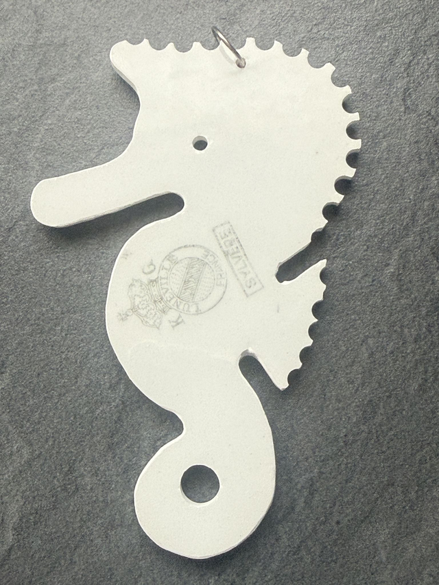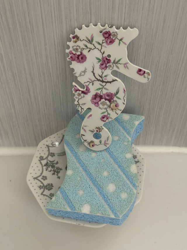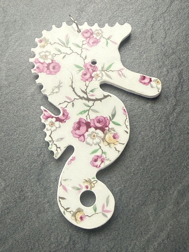 Offrez une seconde vie à cette assiette qui était bien abîmée sur son rebord. Cet hippocampe décoratif a été soigneusement découpé et façonné à la main à partir d’une assiette en faïence de Lunéville. Ce n’est pas un moulage industriel mais un fragment d’histoire transformé en objet de décoration contemporain et poétique. Motif floral classique avec des roses anciennes dans les tons de rose sur un fond blanc. Un style indémodable et très « campagne chic ». Découpe artisanale épousant les courbes de l’hippocampe, bords polis avec soin pour un rendu lisse. Cadeau idéal pour les amoureux de l’artisanat éco-responsable.