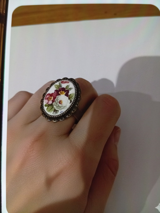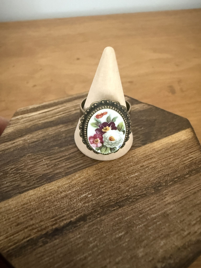 Délicate bague ovale ornée d'un fragment d'assiette en faïence ancienne.