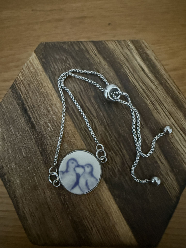 Ce bracelet allie finesse et poésie avec son cabochon en métal argenté orné de deux oiseaux