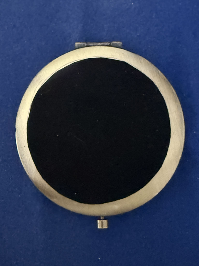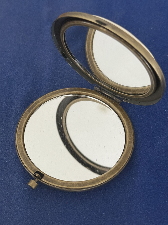 Ce miroir de poche est une pièce unique qui allie le charme de la brocante au design contemporain. Son couvercle est orné d’un fragment de vaisselle ancienne, offrant une seconde vie à une faïence de caractère. Le médaillon central présente une illustration florale en monochrome bleu nuit sur fond crème. La structure est en métal couleur bronze qui lui donne un aspect vintage et chaleureux. Format rond avec une ouverture par bouton poussoir. Le dessous est recouvert d’un morceau de velours noir. Il se glisse discrètement dans toutes les poches ou pochettes de soirée