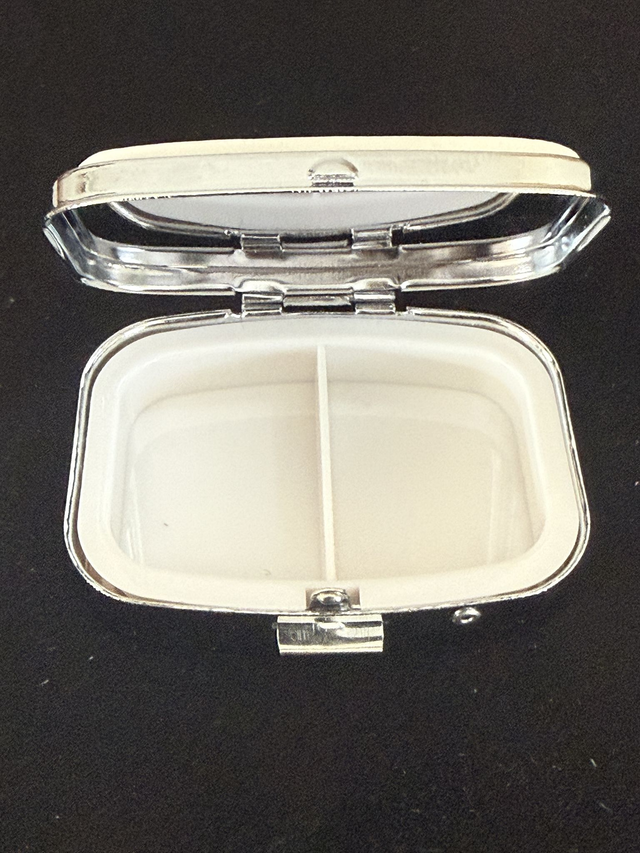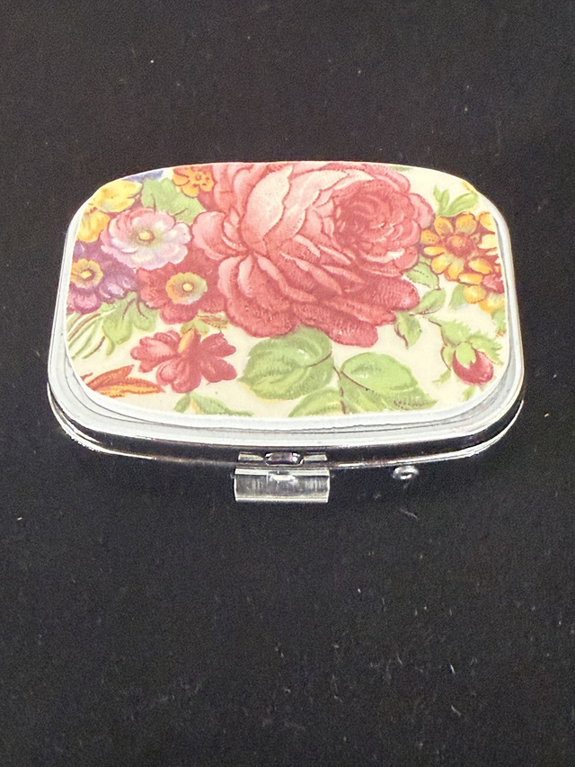 Ajoutez une touche d’élégance et de romantisme à votre quotidien avec ce pilulier de poche. Alliant l’aspect pratique à l’esthétique de la vaisselle ancienne, cet objet est parfait pour organiser vos médicaments. Le couvercle présente un magnifique décor de fleurs, dominé par une rose ancienne dans les tons de rose poudré et de rouge, entourée de feuillages verts et de petites fleurs champêtres. Ce pilulier est équipé d’un bouton poussoir robuste pour éviter toute ouverture accidentelle
